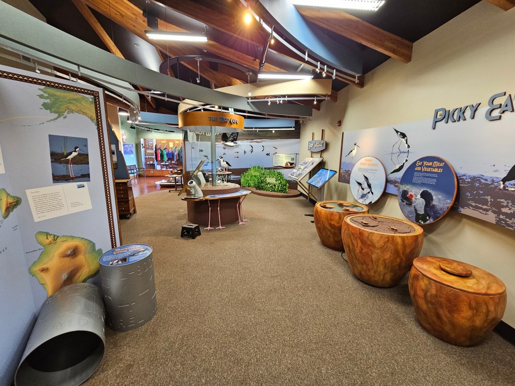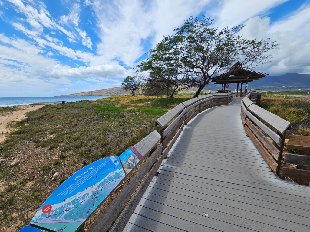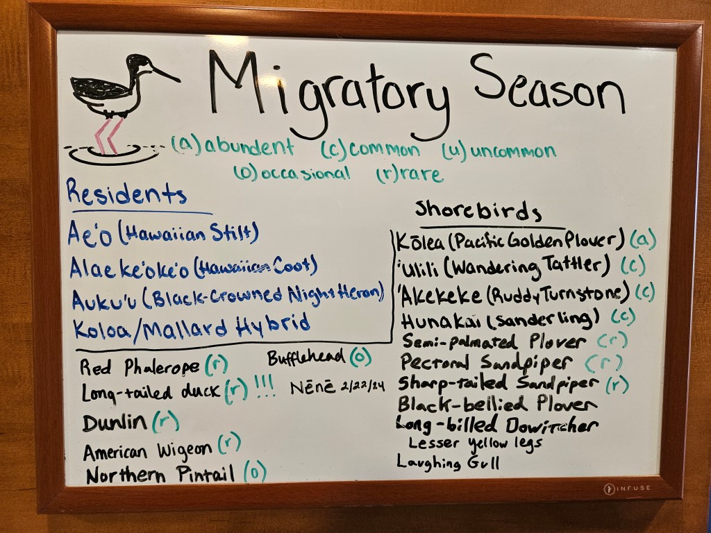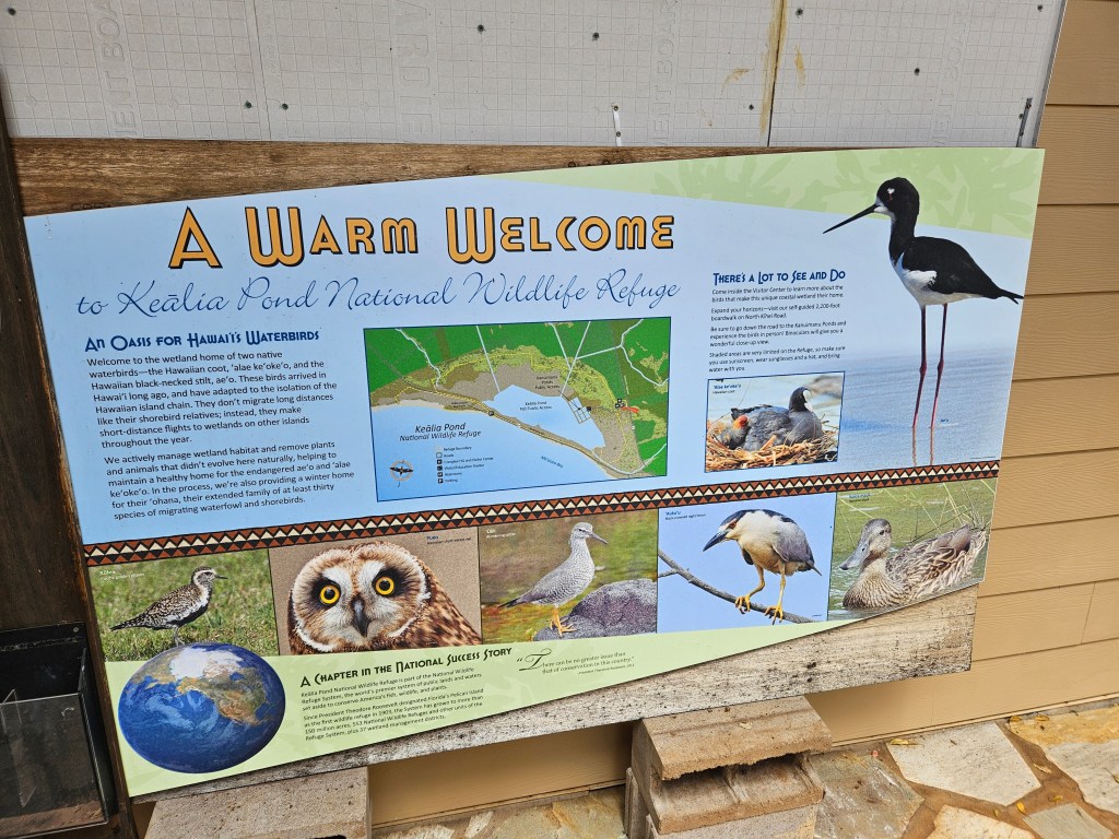 Kealia can be accessed one of two ways: the recently reopened visitor center off the Piilani Highway, or the boardwalk along Sugar Beach. I haven’t been to the visitor center, although it originally opened way back in 2012, so I decided to start there. The building is unassuming, but an excellent place to become acquainted with the refuge. It has what you would expect from a visitor center: a breakdown of the history and biology of the refuge, areas for student groups and presentations, daily report resources for birders, and a small gift shop. Shout out to the very pleasant docent at the front desk who oriented me to the interior pond area and pointed out some of the seasonal migratory and endemic birds that had been recently spotted.